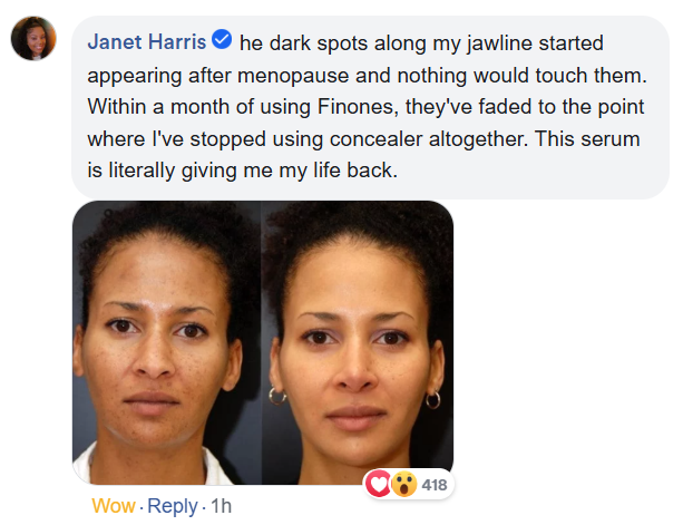 "Without a doubt, the best of the best for black skin! I've spent a fortune on products claiming to work for Black skin, and this unique Finones is the undisputed winner. As I approach 69, my skin looks considerably younger – the dark spots along my jawline have faded and the texture is much smoother. This isn't just a review; it's my secret to radiant Black skin. No attached picture here; try it for yourself and feel the magic that actually works for our skin type."